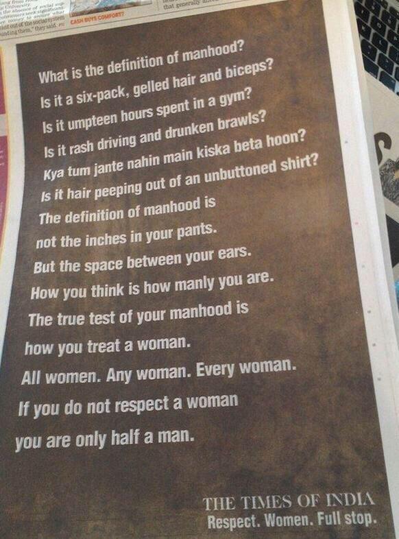The Times of India – respect women Posted by spiralofhope on 2015-05-30 This is an image for The Times of India – respect women. Images navigation ← Previous Next →
